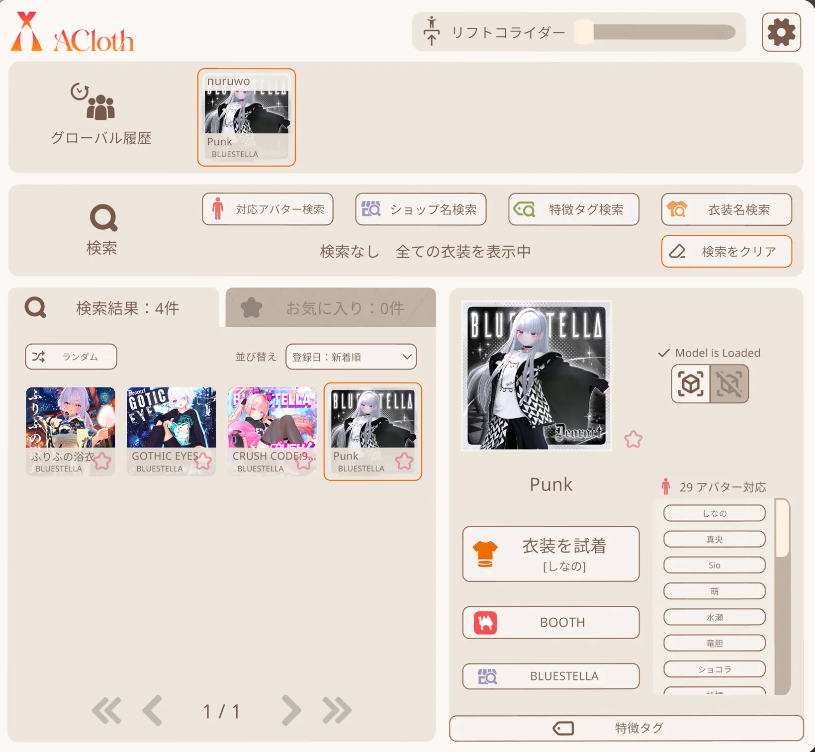 | 検索 | 対応アバター、ショップ名、特徴タグ、衣装名で絞り込み |
