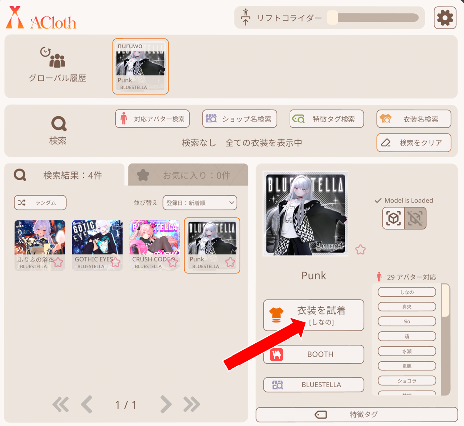 試着アバターは運営で管理され、VRChat名「ACloth」アカウントへアップロードされます。