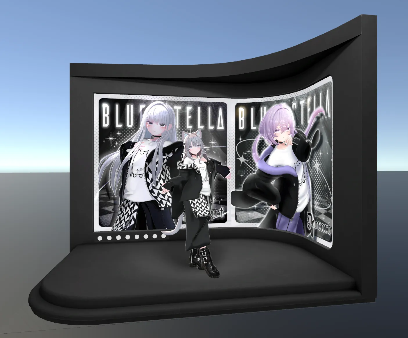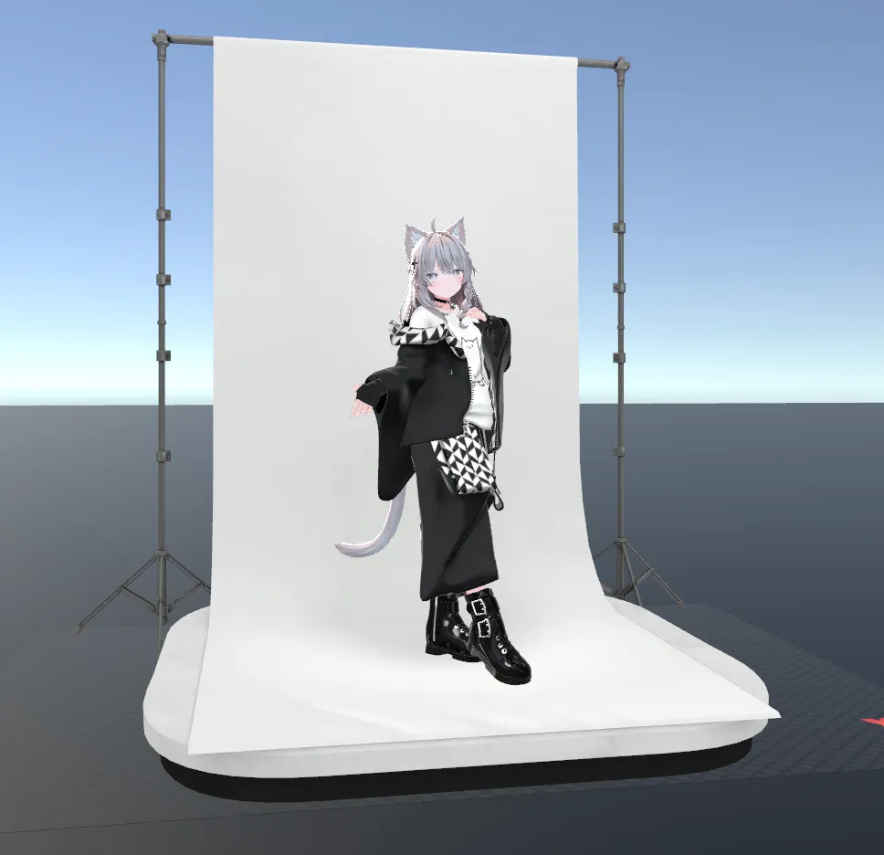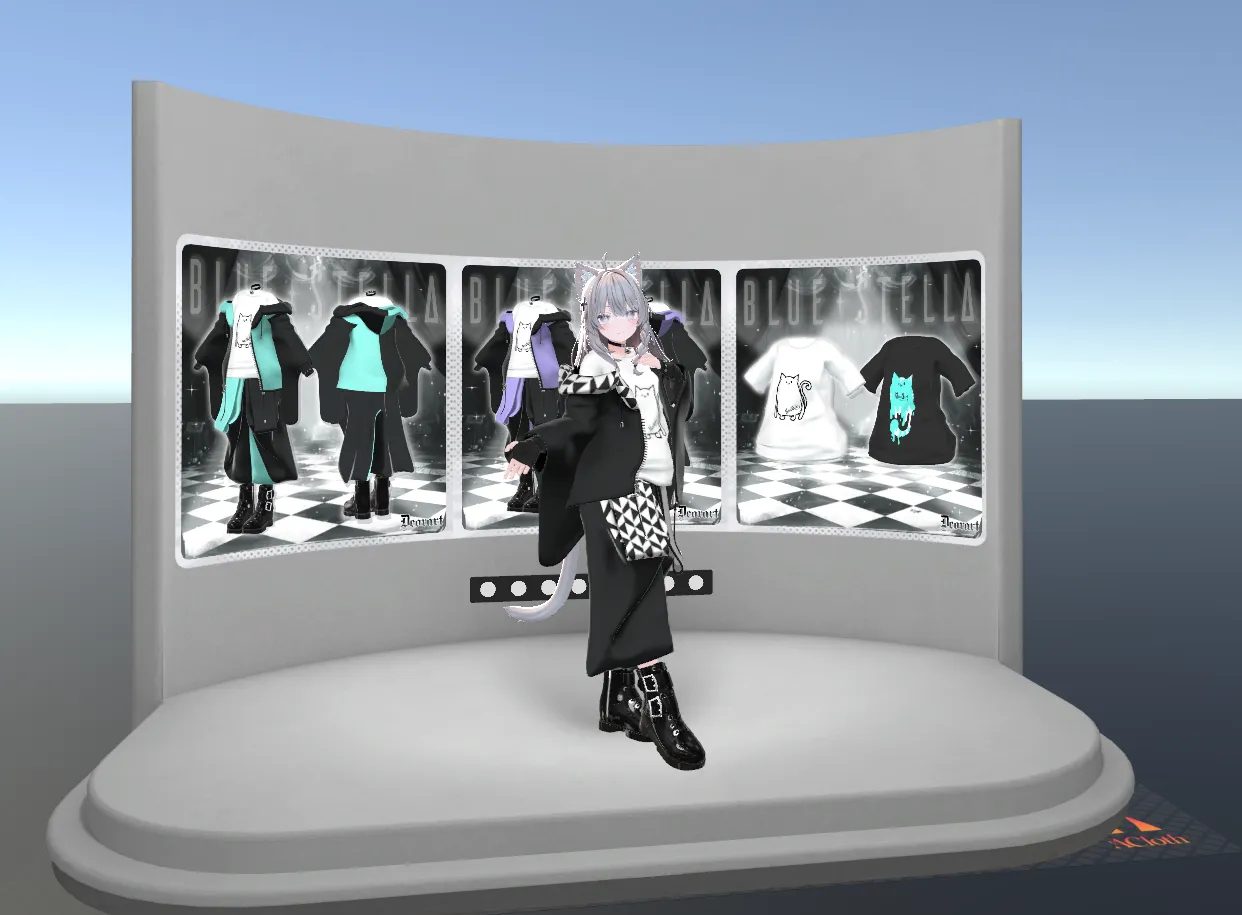 衣装モデルだけでなく、展示ブースや背景モデルも同時に表示できます。詳細は入稿データ仕様をご確認ください。