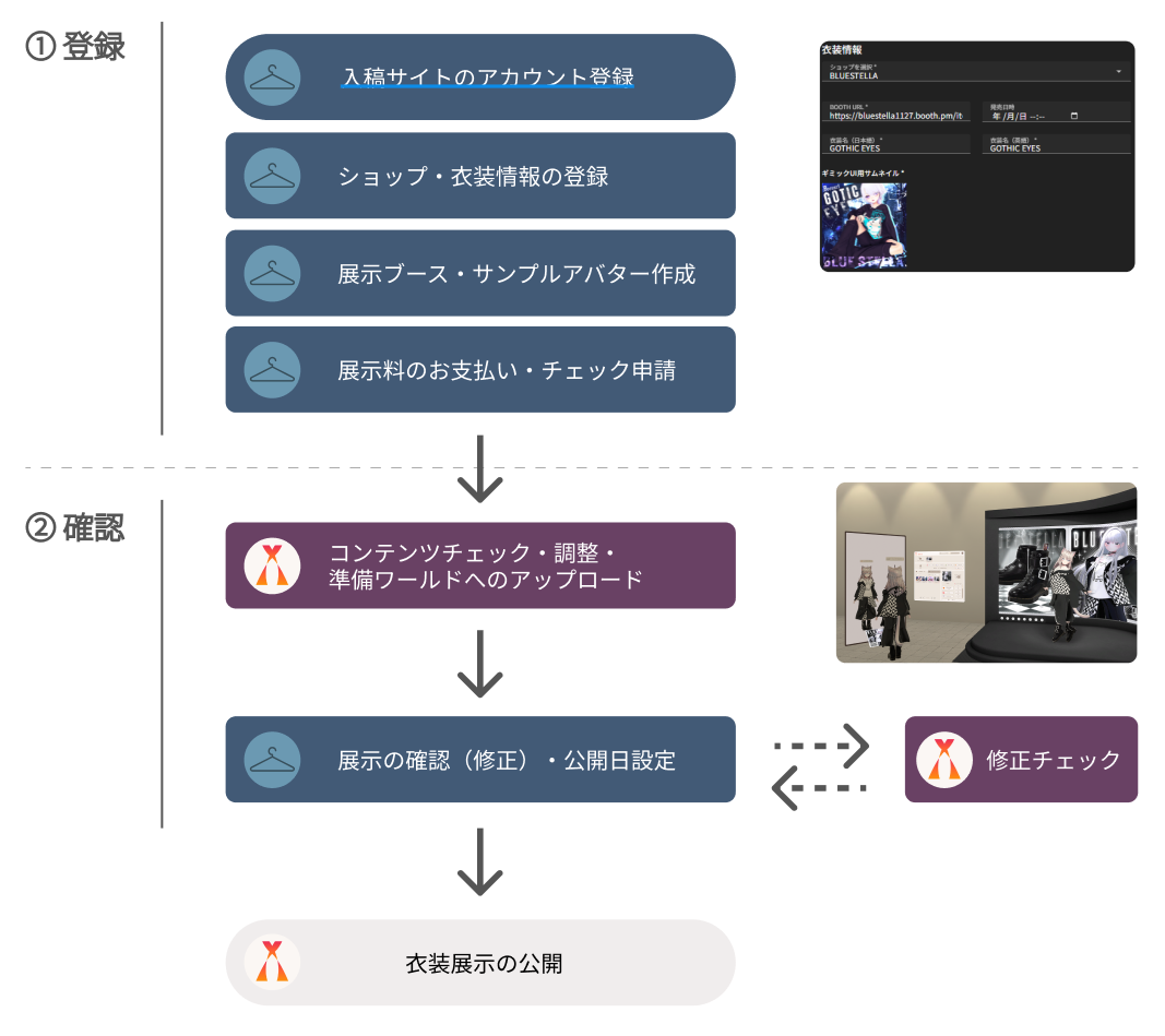 展示できるコンテンツの表現や禁止事項はガイドラインを、規約は衣装展示サービス規約で確認ください。
